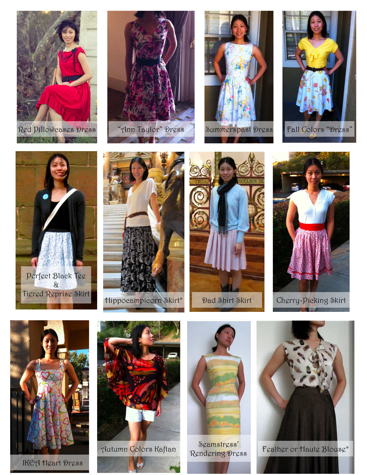 In 2010, I had only just started sewing for real. I started with easy elastic waist skirts and a couple of terrible zipper insertions in skirts with fitted waistbands, a couple of t-shirts, and some zippered pouches. I participated in Self-Stitched September for the first time and was absolutely hooked on wearing my own creations. So in the beginning of 2011, I resolved to learn more, tackle more difficult projects, and most importantly, sew every week. I was inspired by the Sew Weekly project, and even though I didn't get on board with their challenges until the end of the year, I was pushed to explore sewing more and figure out what my style was. If sewing in 2010 was characterized by becoming comfortable with my machine and trying simple projects as guided by other bloggers, sewing in 2011 was characterized by becoming confident enough to try my own project as guided by my own quirky sense of style. And good golly, if you look at the progression of pictures from January to December, things definitely get weirder!