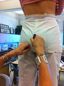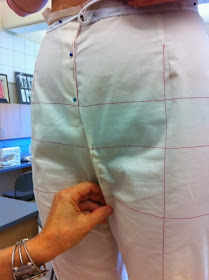 We all had to take turns changing into our muslins and standing on the tabletops and our professor walked around telling our group members what to pin and cut into to get the fit right. What helped a lot for seeing where to make alterations was having the grainline, high hip, low hip, knee, and calf lines basted in. That way, we could see where things weren't hanging plumb or perfectly parallel to the floor all the way around.