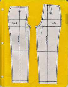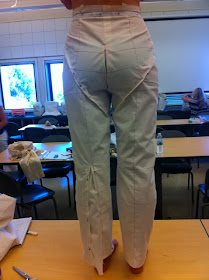 Last week in class I tried on the muslin made from the pants sloper, which was drafted up from my measurements. I think it's worth repeating my professor's words of warning: even a sloper drafted to your measurements isn't going to be perfect right off the bat, because the way those numbers are distributed is different on every person. Depending on whether you carry your weight in the front, side, or back, a 40-inch hip measurement could mean several very different things. One's legs could be 25 inches long, but the angle at which they come out of your hip, the amount of padding on one's inner thigh, and even the way one typically stands can all make a standard draft look terrible, even if it's based on actual body measurements. Still, that said, my muslin looked pretty good for a first try -- definitely better than all the vintage 60s pants patterns I've tried in the past!