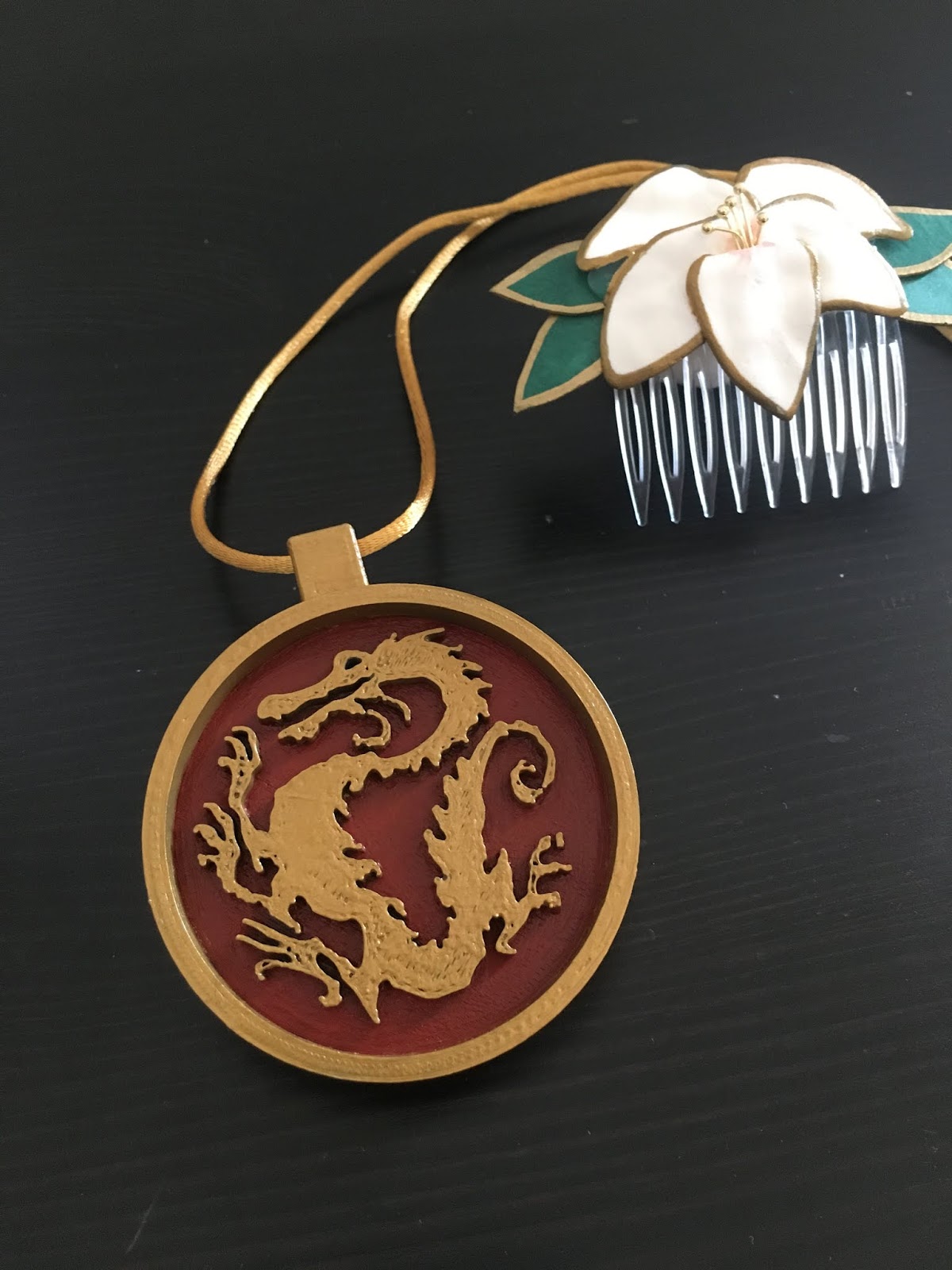 Props: For the crest of the emperor, I got mine 3D-printed with this free file, and then I sanded and painted it with acrylic paints and sealed it with a matte polyurethane varnish. For SHB#2's crest, I woodburned a little wooden gift tag that I had in the stash and then painted and sealed it in the same way. The color is slightly different on hers because of the light beige of the wood versus the dark gray of the 3D-print plastic. For the hair clip, I made mine out of Crayola Model Magic (petals), cardboard (leaves), and gold head pins, all hot-glued to a plastic hair comb and judicious colored with markers. SHB#2's hair clip was a standard child's white flower hair clip that I added rhinestones and a green fabric leaf to, and again colored with markers.